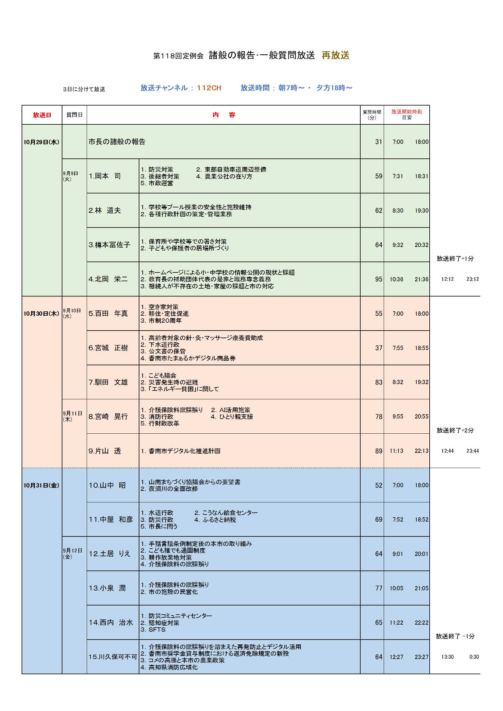 • 香南市議会9月定例会 再放送市長の諸般の報告と一般質問の順番
