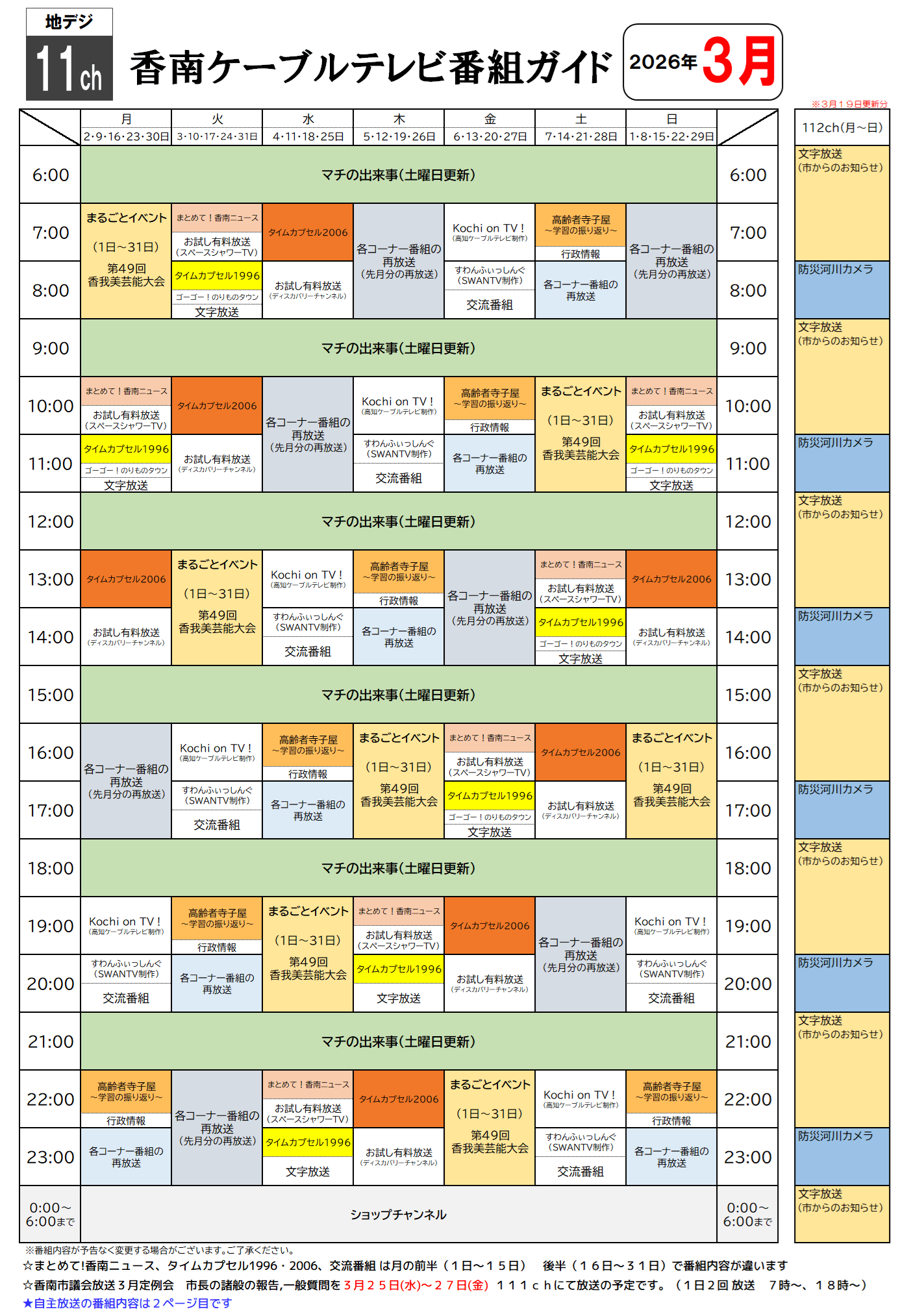 • 香南ケーブルテレビの3月号1ページ目で時間帯ごとの番組表が記載されています。