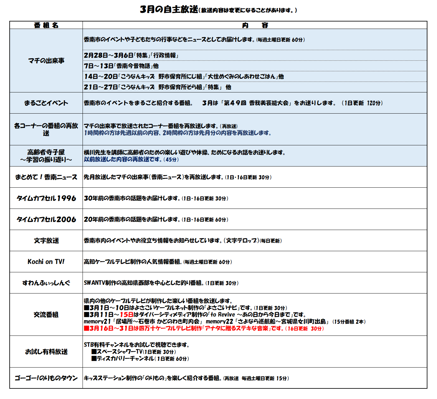 • 香南ケーブルテレビの3月号2ページで番組内容が記載されています。