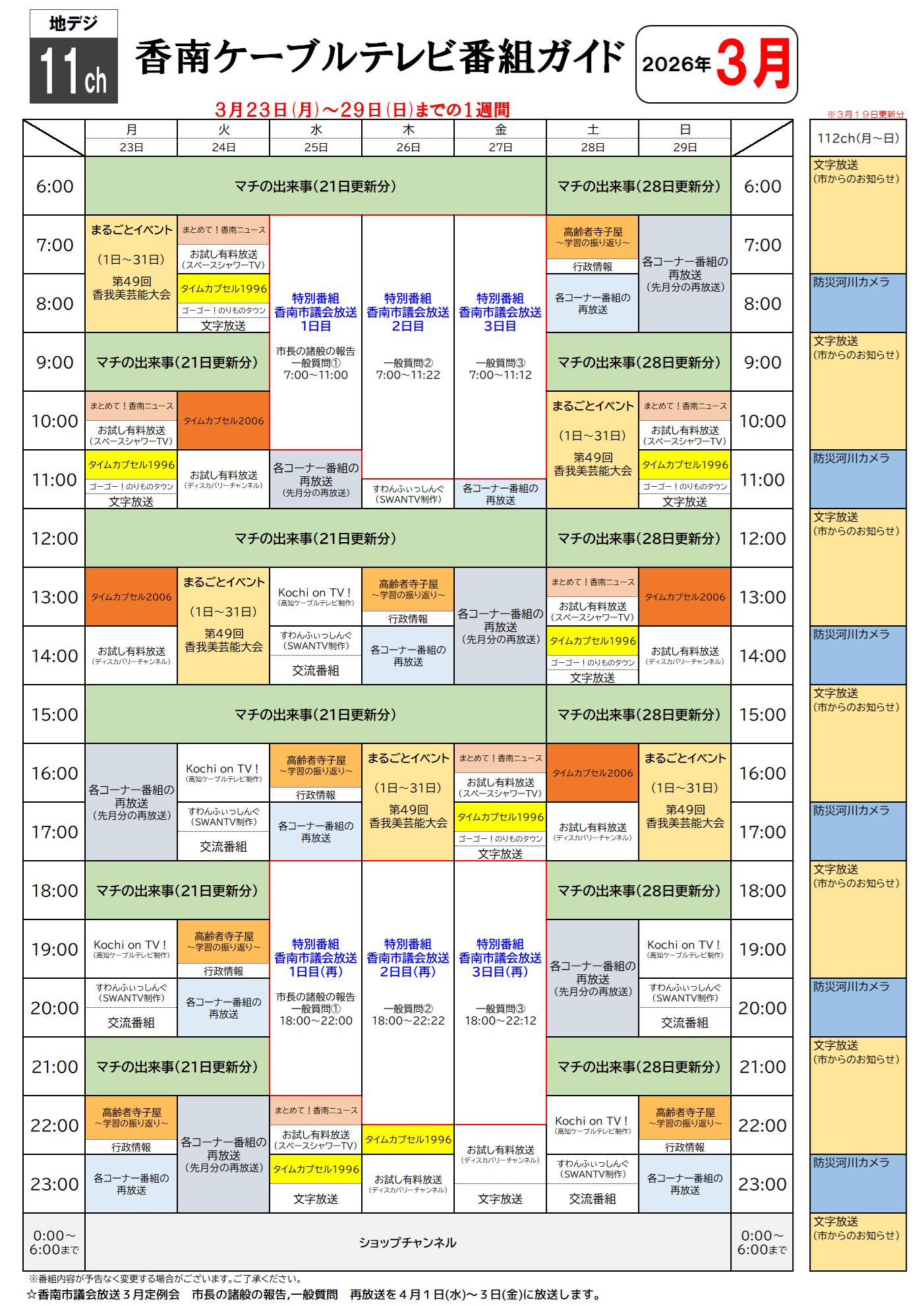 • 香南ケーブルテレビの3月23日から1週間分の番組表です。
